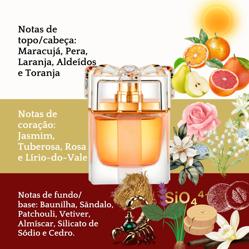 No coração da fragrância , um bouquet floral desabrocha, revelando a feminilidade e sofisticação do Jasmim , da Tuberosa , da Rosa e do Lírio-do-Vale . Essa combinação equilibra frescor e intensidade, trazendo uma sensação romântica e sofisticada à composição.