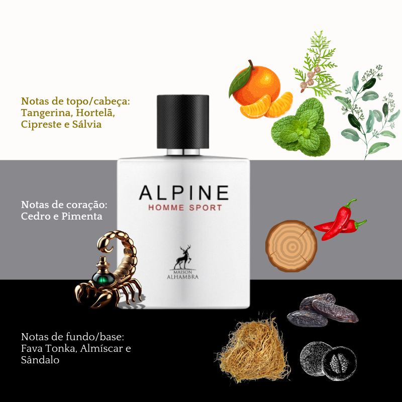 Alpine Homme Sport , da Maison Alhambra , é uma fragrância perfeita para homens que exalam energia, vitalidade e espírito aventureiro . Com sua essência amadeirada aromática , esse perfume traduz a masculinidade moderna com um toque revigorante e sofisticado.
